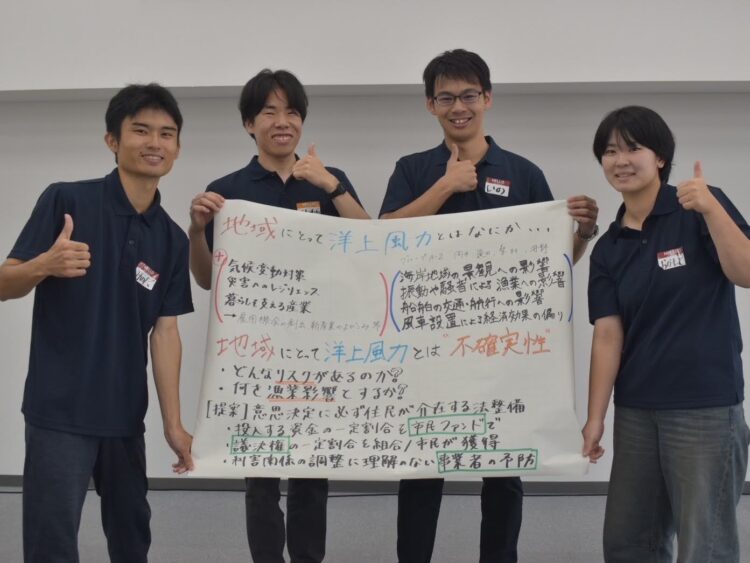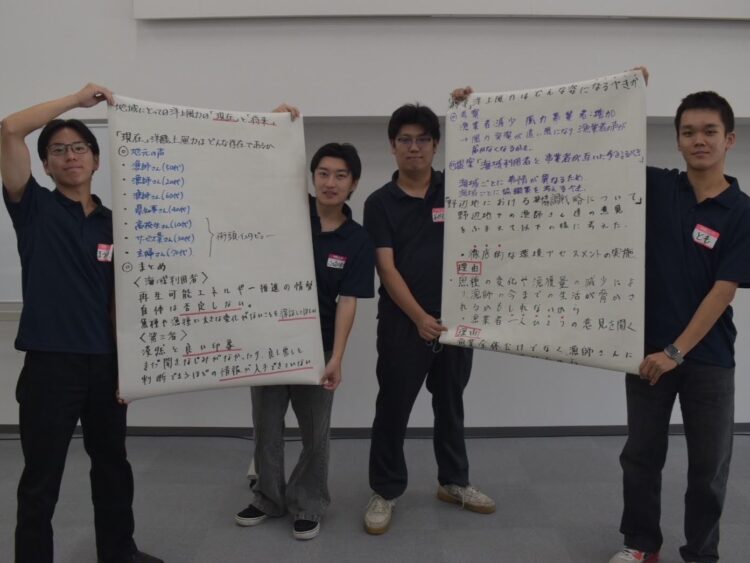 - この度は、様々な観点から洋上風力発電開発への理解を深められる貴重なご機会を頂き、誠にありがとうございます。漁業者さんやO&M業者さん、県知事さんといった方々が各々のお立場でお持ちのご意見を伺うことができ、さらには全国各地から集まった洋上風力に関心を持つ学生達と交流でき、洋上風力発電開発に身を置くことを志す者として大変有意義な4日間となりました。また、地域にとって洋上風力は「今」どんな存在であり、「将来」どんな存在であるべきか、考えを整理できたと感じます。本イベントにご尽力いただいた皆様、誠にありがとうございました。