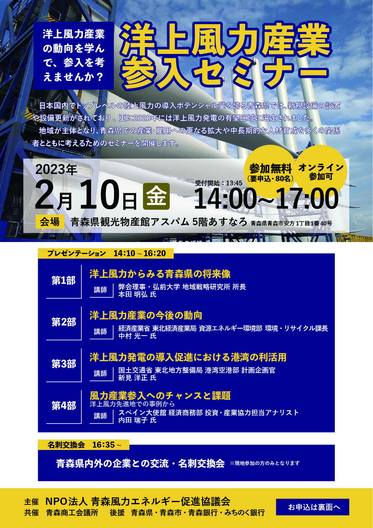 2023.01.28 洋上風力産業参入セミナーを開催します 洋上風力産業参入セミナー ※受付終了いたしました。 2月10日に青森市で開催予定のセミナーのご案内です。 参加ご希望の方は下記からチラシをダウンロードいただき、必要事項を記載の上お申込みください。 洋上風力産業参入セミナー (PDF形式) 前の記事へ 次の記事へ 一覧に戻る